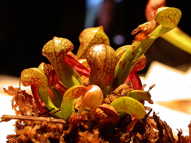 those who know me know that i am very sparing with my praises; but this show was just amazing. i saw plants there that i couldn't even imagine existed in my wildest imagination. i could've spent the entire day there just taking photos of the myriad variations of carnivorous plants, all shapes, all sizes, all colors, from around the world, sundews, venus flytraps, temperate and tropical pitcher plants, butterworts, bladderworts, and some in-between species that defied categorization. every so often there'd be an announcement to come and watch a volunteer feed one of the plants.