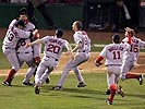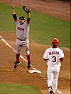while i was chatting online with dan and john about postgame celebrations, julie was once more a nervous wreck, anxious that the red sox would screw up the victory somehow. 7th inning. 8th inning. finally, the last inning of the game, 3 outs away from a world series championship win. pujols gets on base. rolen gets out. edmonds gets out. then renteria grounds the ball to keith foulke, who almost walks it over to first base, making sure he doesn't drop the ball, before tossing it to doug mientkiewicz for the final out. mientkiewicz flies up in the air, and the red sox win the world series!