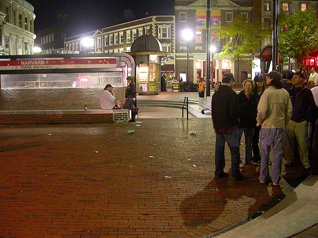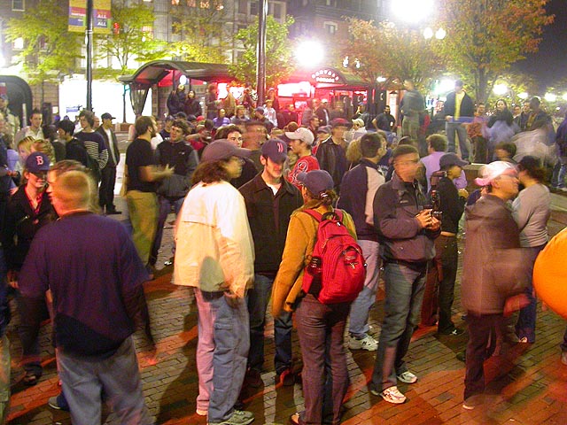 the closer we got, the more honking we could hear. julie brought her horn and would honk it either to reply to cheering fans passing by or to rouse pedestrians into bouts of cheering themselves. the scene in harvard square was surprisingly lackluster following a world series win. either people were saving up their energy for the eventual parade, or, most of them went down to fenway park for the real action. the gathering was much smaller than when the red sox beat the yankees, just enough people to fill the area around the pit. there was no band this time, just an attention-starved trumpeteer dressed in a tuxedo, weakly playing tunes with his instrument. by the time we got there the cops had opened up the traffic from mass ave. the crowd, sensing the lack of energy, soon dispersed.