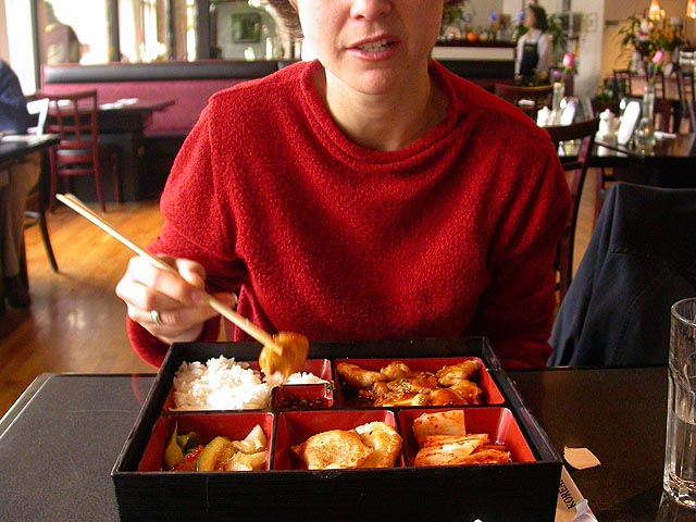 julie and i got together for some korean box lunch specials, visiting koreana on the outskirts of central square. despite the fact that it was in the middle of the day and we were parking in a busy municipal parking lot, julie fastened the club to her steering wheel anyway. cambridge is a safe town! your car will not get stolen! i made some disgusted noises in outrage, and a fellow cantabrigian echoed similar sentiments.