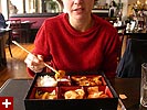 this is how you can tell you have an inferior box lunch: 1) rice occupies a large portion of the entree (in this case, a quarter), 2) there are no sesame seeds sprinkled on either the meat or the rice, 3) kimchee is considered an option (the other being a salad) when both should automatically come with the box lunch, and 4) you're given oily stir fry that looks like leftovers. if you want the best korean box lunches, there is no better place in boston than apollo grill of chinatown. i think maybe we made an effort to stay about from baseball talk, but there was no way getting around it. listening to the conversation of other restaurant patrons, it seems everyone was talking about the red sox. for dessert, we got these bowls of cold soup with bits of crushed ginger and some pine nuts floating on top. julie was afraid to drink hers so i finished off her portion.