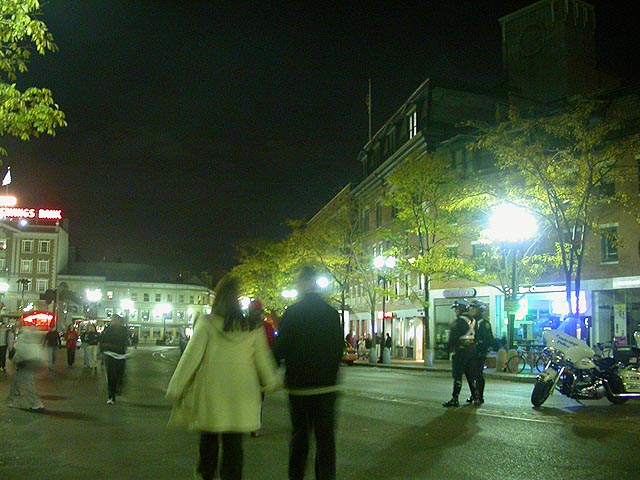 julie called her parents and boyfriend, while i received a call from megan and christine, somewhere in new york city, congratulating me on the red sox's world series win ("i'm a mets fan," megan told me, when i said the yankees might do better next year). i had some champagne in the fridge (a present from bruce on my 30th birthday earlier this year) and figured it'd be the perfect occasion to open the bottle. dan and cymara came over and together the four of us walked down to harvard square to check out the street celebration, which we assumed would be crazy.