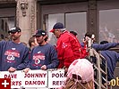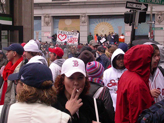 i left my house 30 minutes before the start of the parade at 10am. julie was already calling me before i left the station, asking me which street corner i was standing at. there was a group of college guys, trying to grab some attention by being loud and obnoxious. something about parades that make people like that think they have a free day pass to be assholes. it wouldn't be the first time today i'd meet rowdy crowds. the train was crowded with people decked out in red sox wear (i confess, i don't own a single piece of red sox clothing). the train conductor was telling people to get off either at kendall or charles/mgh, because the downtown area was packed. i disregarded his advice and got off at park street, where it wasn't that crowded (not as crowded as the patriots' parades, where it was just a sea of people standing shoulder to shoulder). i made my way to the corner of boylston and tremont, a good location since it was right on a turn, which meant the parade would have to slow down at that spot, giving me some extra time to snap a few more photos. i called julie as soon as i got there, and i found her standing with sajid. there was a mild drizzle that would occasionally change into a light steady rain. i opened up my umbrella a few times, but not wanting to obstruct anyone's view, and with the showers dying down, i put it away.
