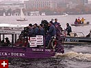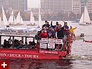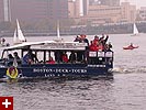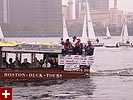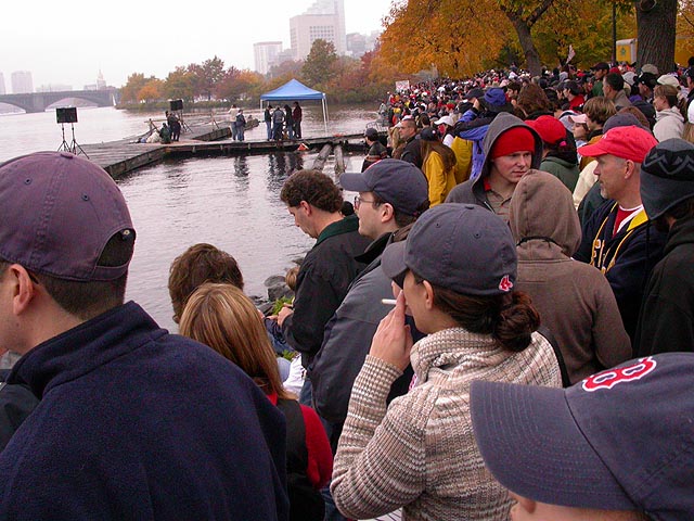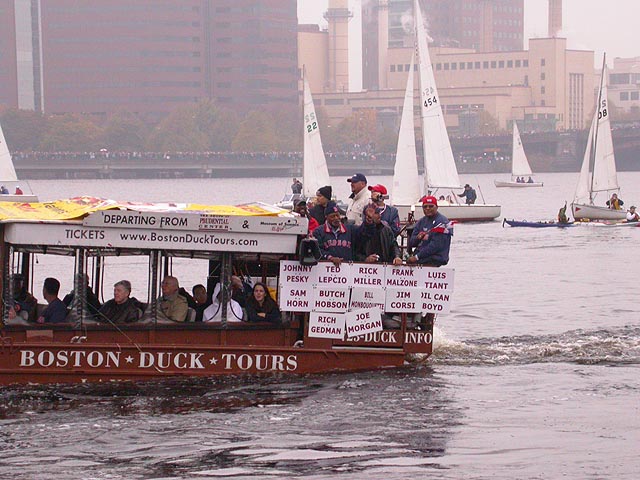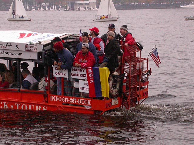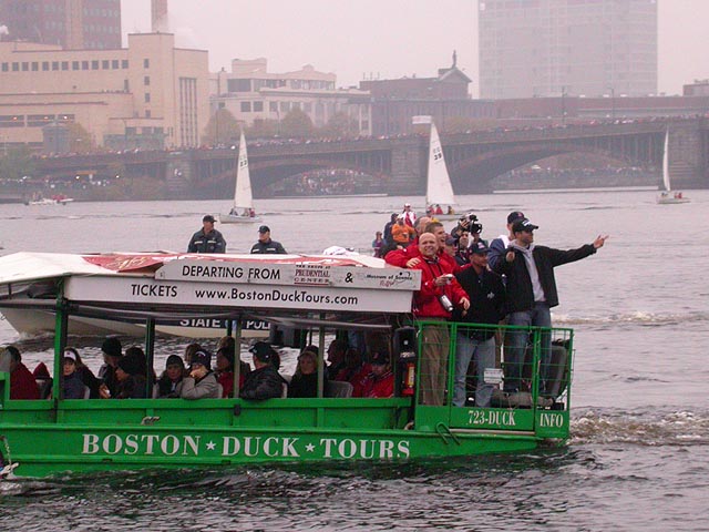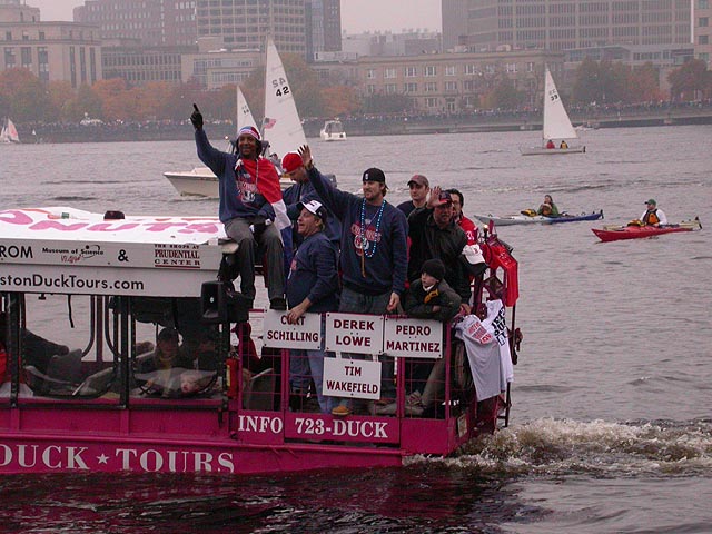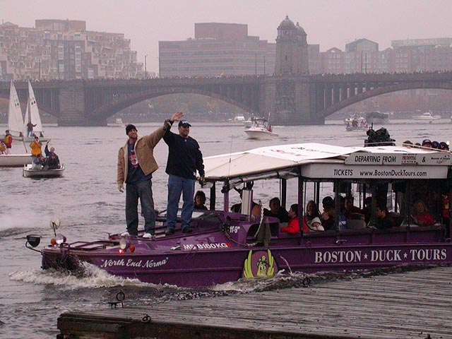 vendors worked the crowd with $5 red sox t-shirts dispensed from trash bags. i watched some college boys drink beer and smoke, one boy in particular using the grassy ground in front of him as a spittoon. out on the floating dock, the DCR had speakers set up and a deejay was playing crowd pleasing music. sailboats crisscrossed the water, as well as a handful of seemingly-illegal kayakers. when the duck boats finally arrived, they were so heavy with players that the tailend of some those vehicles looked like it was nearly submerged in the water.