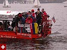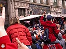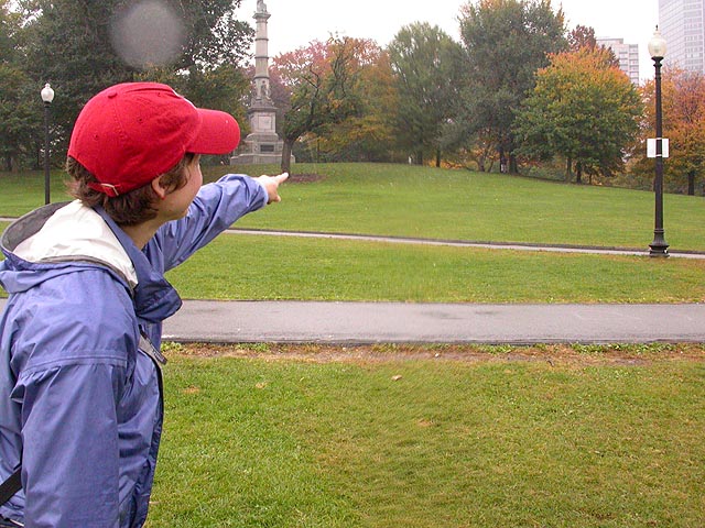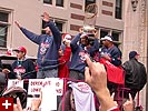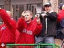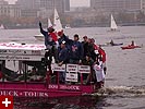 it took over an hour before the convoy of duck tour boats at where we were standing. the excitement level was infectious, and even someone like me who normally doesn't participate in any sort of cheering was pumping my fists in the air and shouting love to the players. the entire procession passed us within 5 minutes. the crowd quickly dispersed, everyone heading to the charles river, where the parade route was extended as of last night. following the crowd, sajid broke away from the ranks to use the "bathroom" behind a tree, within plain sight of passerbys (earlier, julie had gone savage as well with her harrowing tale of "behind a bush" business).
