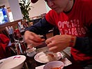 i came home around 3pm and found two men sitting on the front stoop of my house. "hi," i said, "are you waiting for someone?" "oh no, we're just sitting around," one of them said. "oh," i replied, and then motioned that i was trying to get inside. they both looked kind of scraggly, perhaps homeless, one guy looked like the last sorry red sox fan in the master card commercial, the other one looked like the vehix dude without the box. vehix was reading from a book, red sox fan seemed bored. they didn't leave right away, i watched them from the window, thinking maybe i should take a photo in case i need to identify them for the police. a few minutes later they left. could they be casing the neighborhood? well good luck breaking in since i'm always home. i watched the tape that i'd recorded of the parade. i was determined to spend the rest of my saturday napping, waking up to make some sort of dinner. i watched something's gotta give (2003) on HBO. my plans changed when renata called me a little bit before 6pm. having spent a long day in class and completely wired up from too many cups of tea, she called asking to go see a movie, a comedy. we decided i heart huckabee at 7:30pm in harvard square, and i told renata to come over. she called right back telling me a neighbor's cat had ran into her house and she couldn't make it leave so she might be delayed. i went down the street to boca grande to get some dinner burritos. walking back, renata caught me on the street and gave me a ride home. we ate our burritos, and i got a chance to show her a ball of flowering tea. renata tried some watermelon seeds, which despite the fact that she had problems opening them, quickly became addicted to their sodium-rich goodness.