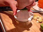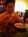 i made prik khing curry with orange bell peppers, baby corns, basil, and strips of chicken. renata, perched on a bar stool, took photos while i cooked. the first trick-or-treaters of the evening was a girl clown and a boy ninja. i gave them each 3 pieces of milk buds, whoppers, and kit kat. although there were a lot of children on my street, none of them rang my doorbell. finally renata and i ended up standing outside with the door open, actively soliciting children to come and take some free candy. a group of 4 kids came by, and while her friends left to ring other houses once they got the candy, i told the last kid, "don't tell anyone, but i'm going to give you an extra piece of candy." the last child to come to my house was a little toddler dressed up in a dinosaur costume. his mother carried his plastic jack-o-lantern full goodies, and he said "trick or treat" after we had already given him his treat.