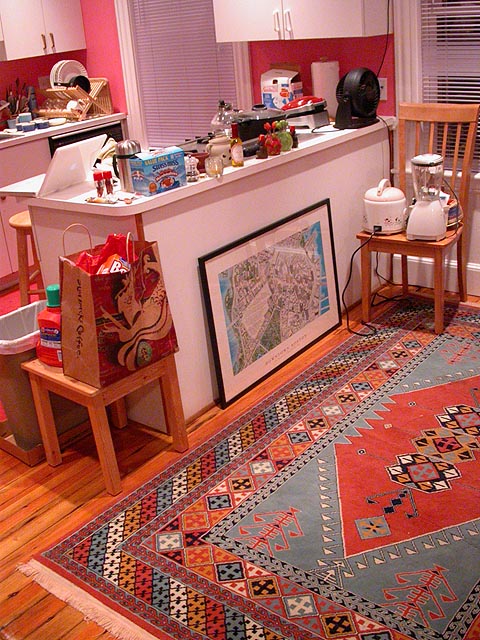 and the guy said he'd be willing to come over my place and dust for fleas at a special discounted rate when he has time. i would've never even considered it otherwise, but since it's cheap i figured it wouldn't hurt to let a professional exterminator solve my flea problem. so then the rest of the day i spent cleaning out my house even more. anything that could be picked off the floor i removed, then i vacuumed, rearranged the clutter, and unfurled a rug that'd been sitting underneath the bed (it actually looks pretty good in the kitchen). the guy ended up not coming, so i'll have to call him up tomorrow. funny, but just the prospect of having a professional come by made me feel better about my situation, and my flea problem went from something i couldn't stop thinking about to just a minor inconvenience i'll take care of soon.