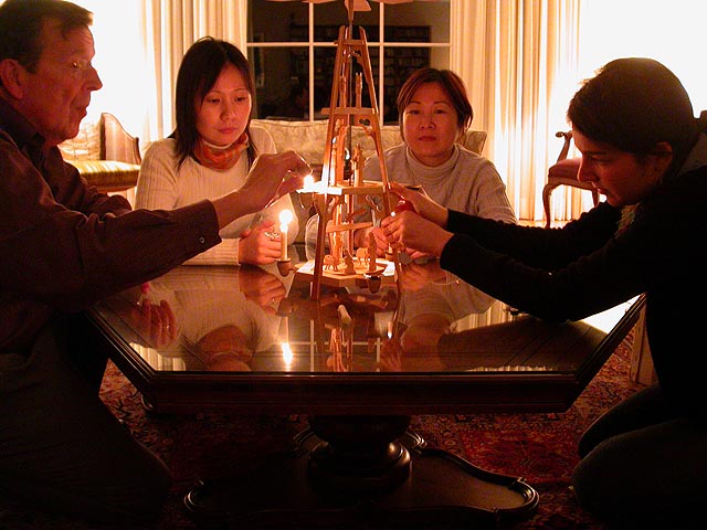 i was glad to be back at renata's parents' house. i was tired and slightly motion-sick, so it was a relief to just be doing nothing for a while, to catch my breath as it were. renata made her father bring out a childhood christmas toy of theirs, a wooden triangle with three layers depicting the creche. strategically placed candles were lit, with the heat from the candle spinning wooden blades on top of the pillar which in turn would spin the creche scene. it was pretty cool and i sat mesmerised for many minutes watching baby jesus circle round and round.