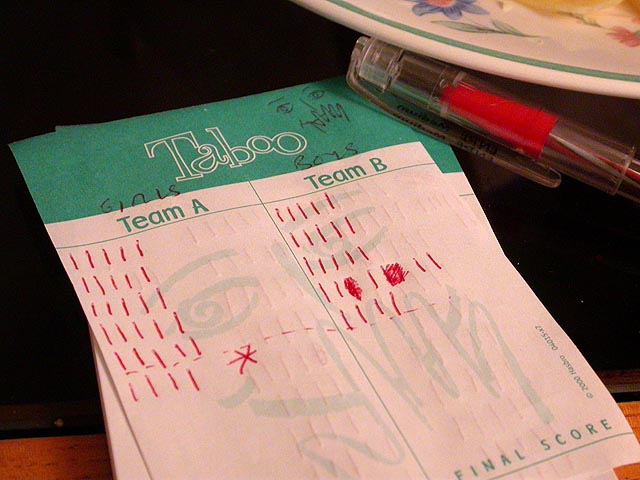 i bought some wine coolers then walked to maura's apartment. i didn't realize how close it was, just a few blocks away. when i got there it was just andrew and maura. andrew, with his accounting expertise, finally explained to me how "amortization" works. later maura's friend katie would show up, followed by andy and kara. there was some drama as we tried to open the taboo buzzer battery compartment, securely fastened by a screw. with no screwdriver, we used whatever we could, paperclips, scissors, steak knives, with no success. once we decided we'd go with the human buzzer, we played a game of taboo, girls versus boys. the boys had the lead throughout, until finally in the end the girls came back and tied it. game highlights: katie's "luke-ass george" and maura's "cockatoo." maura wanted to watch some "alf" on tv which i thought was kind of weird (she must really love the 80's), until realized she was actually talking about the will ferrell movie "elf". i'd never seen it before, and actually it was supposed to arrive from netflix today (it didn't), but from the 20 minutes i watched, it looks to be a really funny movie. andrew's friend yentz and yentz's lady friend showed up, we played a few more rounds of taboo (until the girls won). i finally left around 1am.