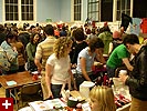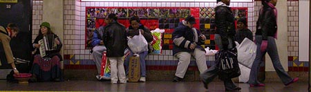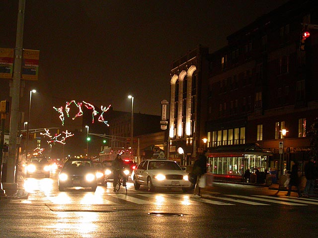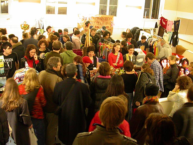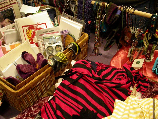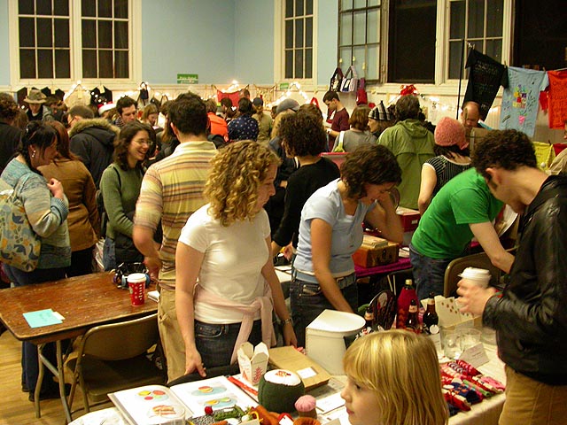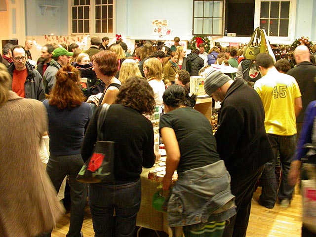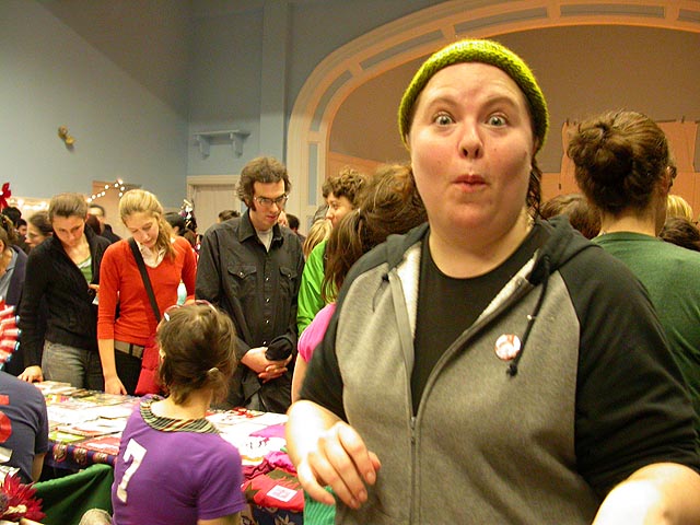 coming back, i decided to stop off at the annual holiday bazaar bizarre, the hipster crafts fair. normally it's held at the VFW hall in davis square (one of the epicenter of local hipsterdom), but this year they moved it to the YWCA in central square. i mistakenly went to the YMCA until i saw a sign pointing me in the opposite direction. when i got there, there was a small line outside. apparently there were so many people inside it was on the verge of violating their fire code for occupancy so we had to wait until some people come out before we could go in. once i got inside, it was ass-to-ass crowded with people, a sea of hipsters. i looked for shannon, who came all the way from cleveland to sell some wares. with my bag full of fruits i had a hard time negotiating between the tight squeeze of folks. the vendors were split up into 2 rooms, one oppressively warm, the other less so. i gave the place a quick look, then left without buying anything.