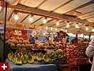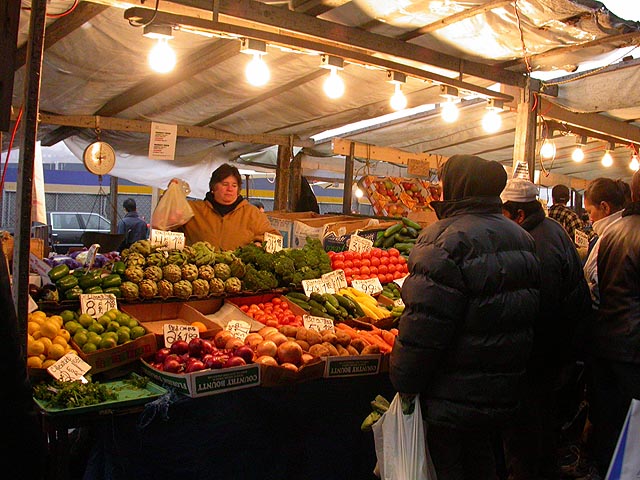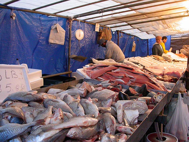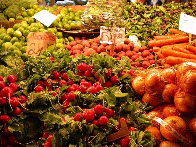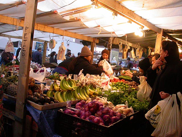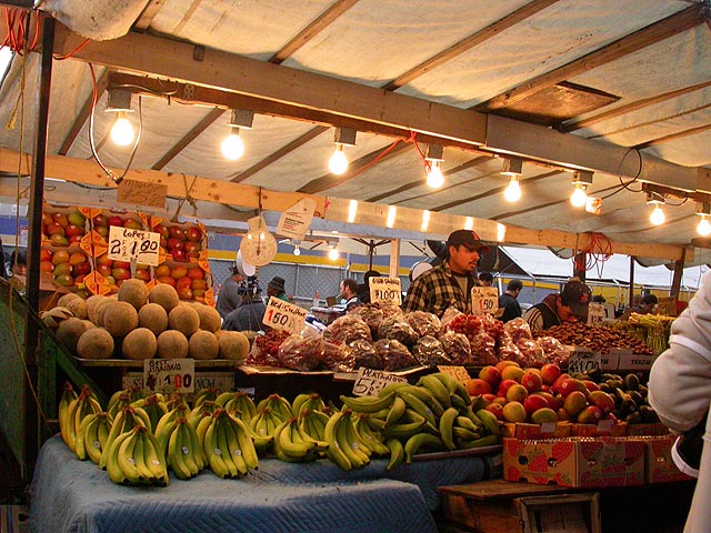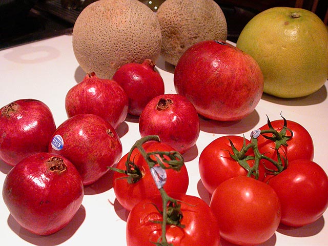 here's how i turned a bad thing into a good thing: i originally wanted to go to haymarket but went the wrong way and decided to just go home decide. this second time around however, i made good on my original plan and walked the few blocks to haymarket, where on weekends it's an open market of produce and fish and flowers and meat, all at reduced prices. walking down the corridor of produce vendors, it was like going to a foreign country, the crush of immigrants, the lights, the colors, the sounds, the smells. i bought 6 small pomegranates for $2, 2 canteloupes for $1, and 2 lbs. of medium-sized tomatoes (6) for $4 (sort of expensive, but that's because of the tomato shortage).