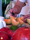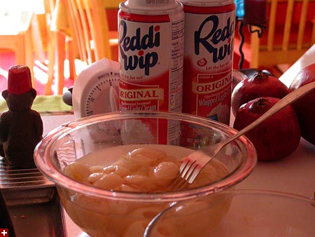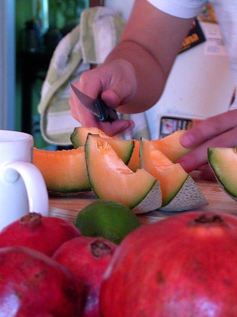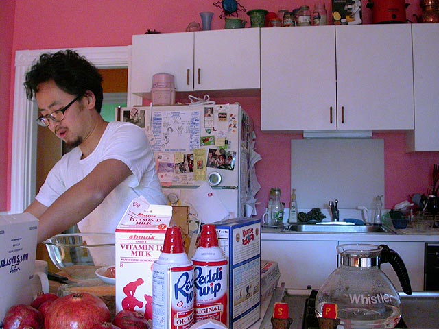 we went into the kitchen where i started making breakfast. the stereo was softly playing christmas music from a radio station, each song getting successively sadder. renata, begging for something to do, got the job of peeling the pommelo. i was missing a few ingredients so i went across the street to get some groceries,