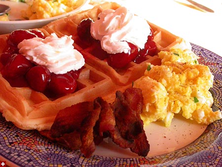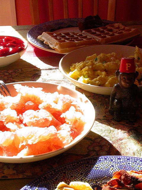 i gave her the number of the cellphone so she could call it (to hear it ring), and also suggested a few places i thought i might've dropped it, including out on the sidewalk. i came back home to see the pommelo completely peeled. i cut up some leftover canteloupes, then started making the belgian waffles, the bacon, and the scrambled eggs. renata helped with flipping the bacon as well as the eggs. i had to open the window and turn on a fan to blow out the grease smell from the bacon.