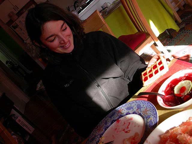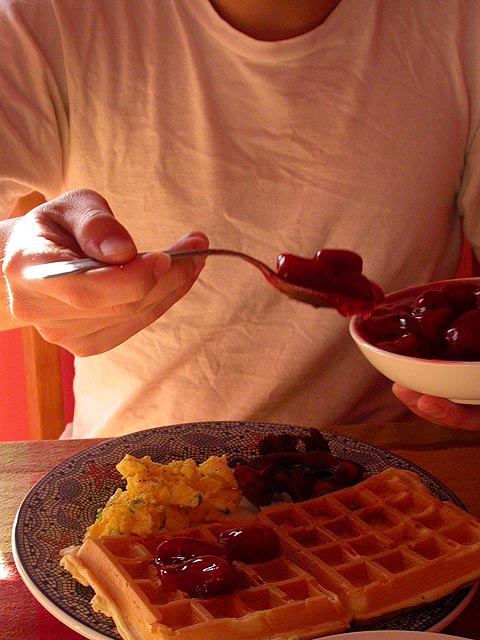 my kitchen is at its best on winter mornings, when the sun is low on the horizon and its rays bask everything in a warm glow. after 2 waffles i was already full. renata seemed like she wanted to hurry up and eat her food so she could start playing with the leftovers. she made a waffle stain glass out of strawberry compote then painted her nails with more of that red stuff. we made new year's resolution for one another, renata said i should eat anymore salt, i said she should stop worrying all the time. i also got to touch her nose, which has always fascinating me in how pointed it is; later renata told me nobody's ever asked to touch her nose before. in the lazy afternoon sun renata also demonstrated some yoga poses; my camera was unfortunately too far away for me to get any photos.