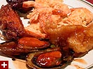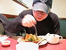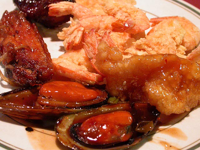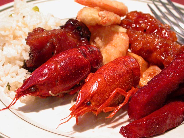 i was resigned to spend another night perfecting my ramen cuisine when gary called me up asking if i was free for some dinner action. he came to pick me up and along the way he told me how this past week he narrowly avoided being killed not once but twice: the first time was when he was buffing a car at the body shop and the machine slipped and tightened the power cord which he had looped around his neck. the second time was at his security job when the metal door of a fright elevator fell off its hinges and came crashing down narrowly crushing him. so tonight we decided to risk life once more with a visit to tin tin buffet, a place my mother has called, "the worst restaurant under heaven." weekday nights the buffets are $9/person. there's a big selection but it's definitely quantity over quality. they had crayfish, which i've never had before, which was pretty much exoskeleton with a little bit of meat.