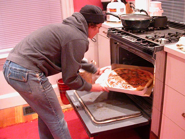 julie was going to make a chicken salad for tonight but then talked her way into buying a pizza from one of the many eating places behind tufts university. the pizza wasn't hot anymore by the time she arrived so she baked it in the oven, box and all. we kept a close eye on the heating, making sure nothing was combusting. we watched a pre-ice-t episode of SVU (circa 2000) followed by a new episode on NBC. it was the lacrosse captain who molested that little girl! not the football coach!