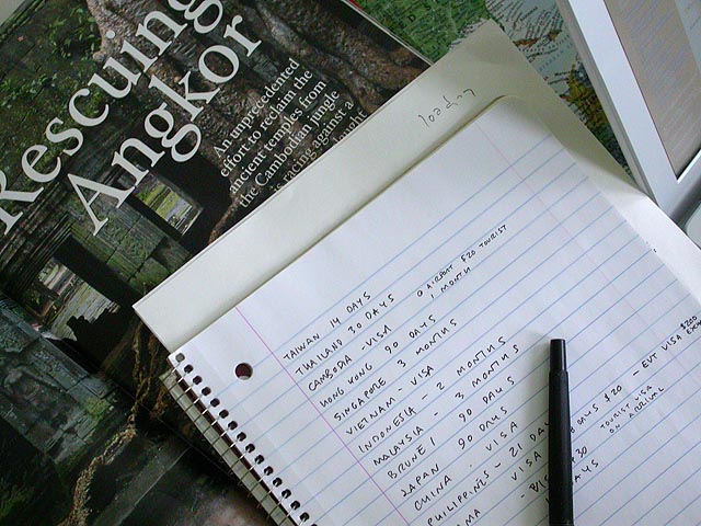 i have friends in japan and hong kong, relatives in taiwan, and i know a contact person in vietnam. my cousin eric is also a travel agent in taipei, so i hope i can get some cheap deals through him. i know for certain there are 5 places i'm going: japan, taiwan, hong kong, cambodia, and thailand. while i'm in southeast asia, it'd be cool to visit a few other countries in that area: vietnam, laos, and burma (myanmar). malaysia, further south, is worth seeing if i can get a cheap flight, as well as singapore. indonesia is interesting too, but the US state department has issued a travel advisory warning for that country for possible terrorist attacks on foreign nationals. after i had my countries, i looked up the visa situation. most places allow unrestricted travel with a few requiring visitor visas. of those that require special visas, half allowed you to apply for a visa at the airport, with only burma and vietnam being the exception. burmese visa is effective for 90 days and can be used for a 28 day stay, with the condition you exchange US$200 into burmese currency. vietnam is the only country with the strictest conditions, with fixed arrival and departure dates. for these two countries i'll either get my visa in taipei or in hong kong.