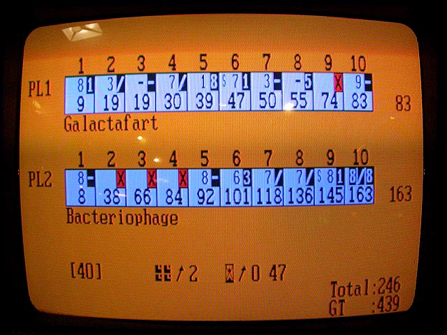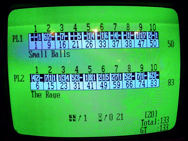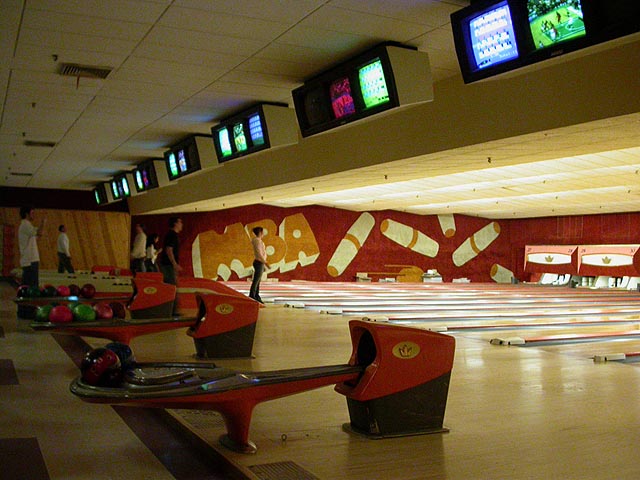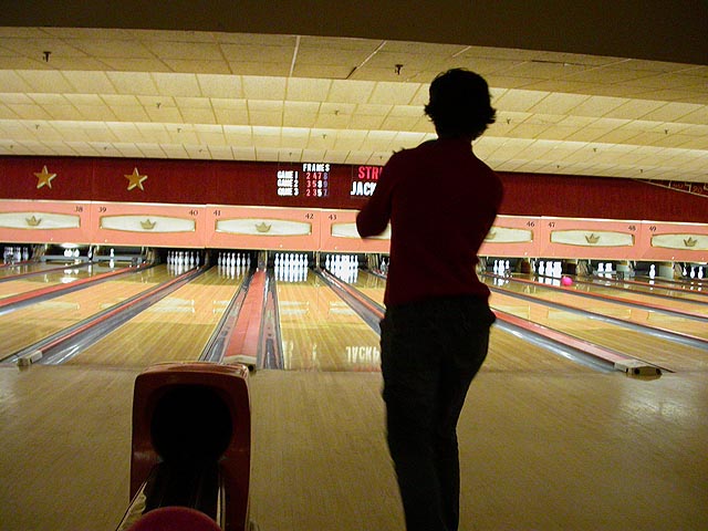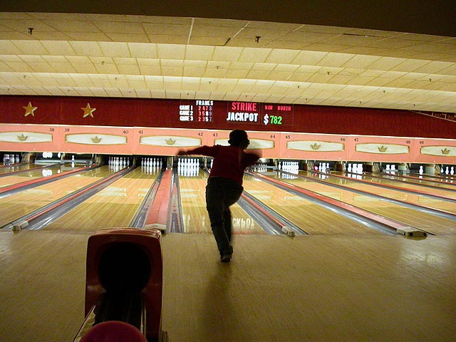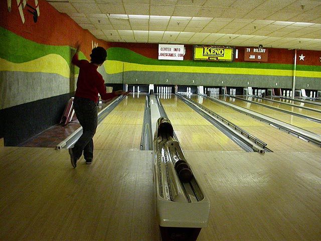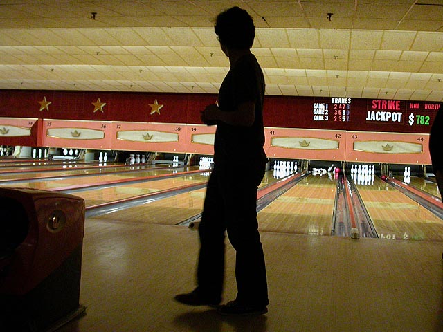 if everyone was a winner then nobody would be a winner, you dig? being a loser marks me as a martyr for society. julie tried to help, tried to give me useful tips, like how to hold the ball, or how to throw, but that just put a kink into my natural flow and the result was several frames of complete gutter balls. i like to let my bowling instinct come out naturally in whatever bastardized mutated form it takes. at one point the ballhog girl turned to me and said, "we both use the same ball," which i don't know if it was a solidarity comment or a remark about how she was kicking my ass too with her slow roll technique.