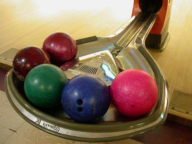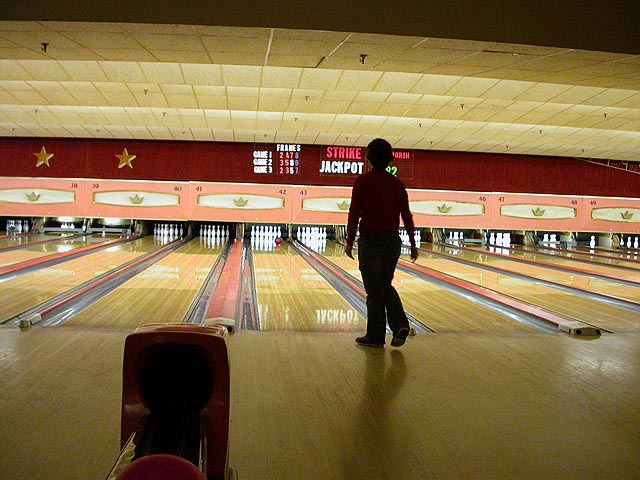balls, but i found mine too unwieldy, so instead i traded down for an 8 lbs. ball, the lightest ball on the rack: as if it wasn't emasculating enough that i was using the sissy ball, it was colored a gaudy pink that could be seen from every lanes, which could've only been made worse if it had glitter and made noises and lights when i used it. nevertheless, it was the ball for me, that is until the girl in the next lane, not well versed in the proper bowling etiquette, adopted it as her own ball. when julie and i politely asked if she was using the ball (she had it cradled in her hands, awaiting her turn), she got all offended. it seemed like a lost cause, one that didn't require fighting over. i'd just waited my turn until she was done with the ball; unfortunately she's one of those slow rollers so i had to endure a lot of waiting.