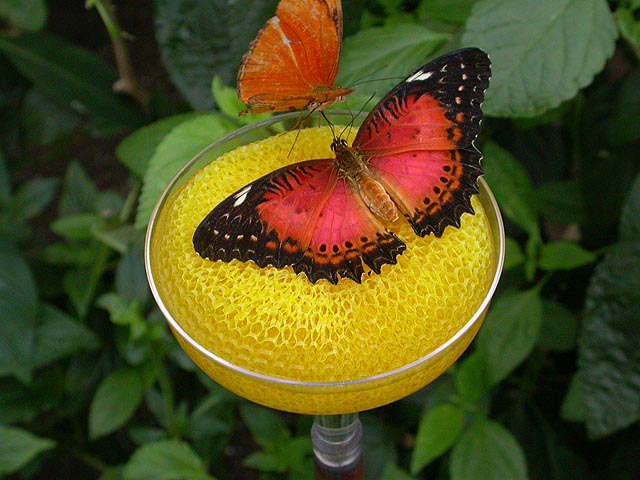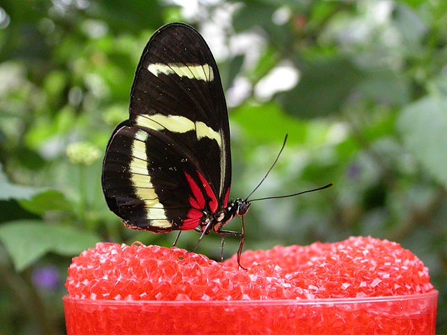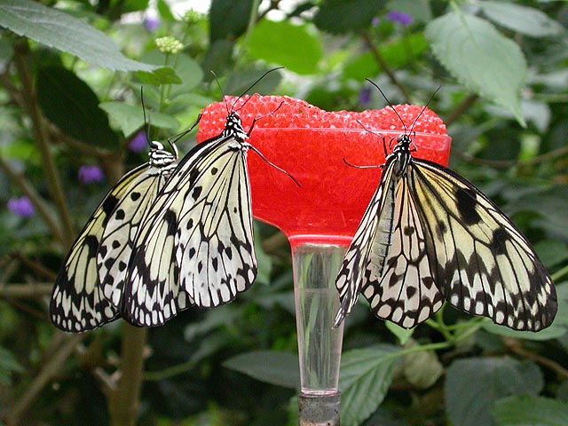 trays of rotting bananas were what they feed on. rice paper butterflies could often found congregated at the sugar water feeders. glasswings were also quite common as well; i remember the first time i saw a glasswing in costa rica it just blew my mind that there was a butterfly with transparent wings, but now, seeing them everywhere, they almost seemed ordinary.