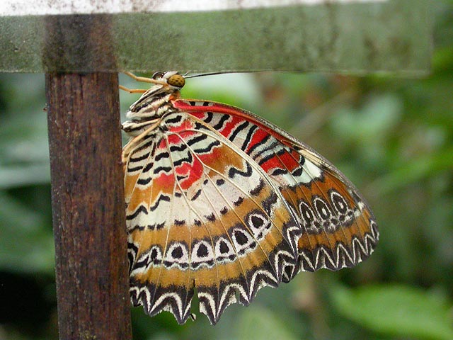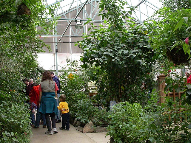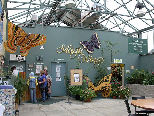 from the outside it looked like several large greenhouses in a row (8000 square feet). through the foggy windows i could see butterflies fluttering inside. we bought our tickets ($8/adult, another $1 for a scorecard with color photos showing you the butterflies you can find) and got some lunch from the adjoining cafeteria (i had a chicken caeser wrap, but they sold novelty food like peanut butter & jelly sandwiches shaped like butterflies) before heading inside the actual conservatory.
