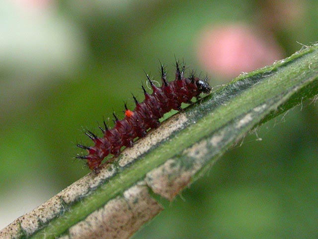 there was a pond filled with colorful kois. a pair of endangered gouldian finches were kept in a nearby case, the female already starting to build a nest. a green hummingbird could be seen periodically visiting a hanging butterfly feeder. and although i didn't see any, there were also firebelly toads hiding about, keeping the greenhouse free of insect pests. i even saw a small caterpillar, not sure what butterfly it was, but it reared up on its back when i got close enough to take a photo.