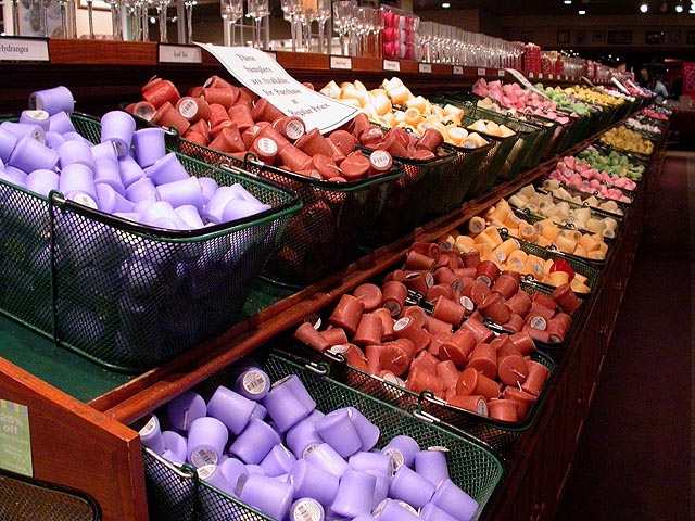 since the yankee candles corporate headquarter was nearby, we decided to pay it a visit. although christmas had been over for almost a month, it wasn't the case in the yankee candles store, where the holiday was still being celebrated in full force, a crazy disneyesque display of yuletide spirit. besides the outdated christmas decorations, there were of course the candles.