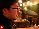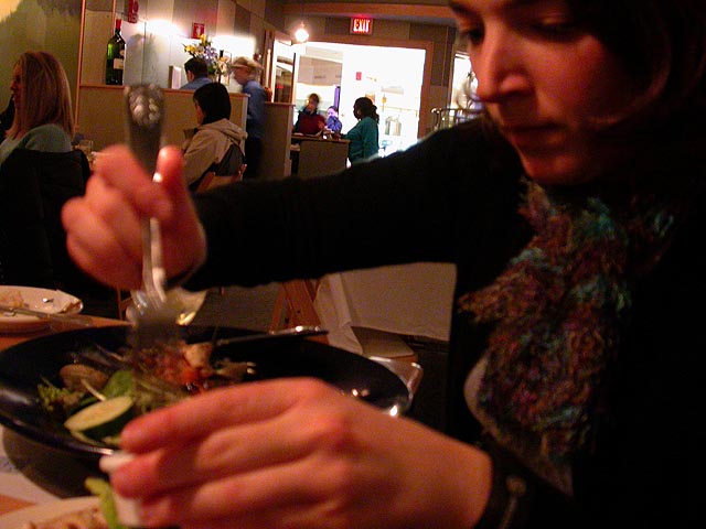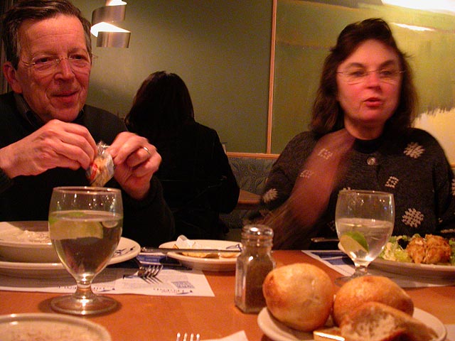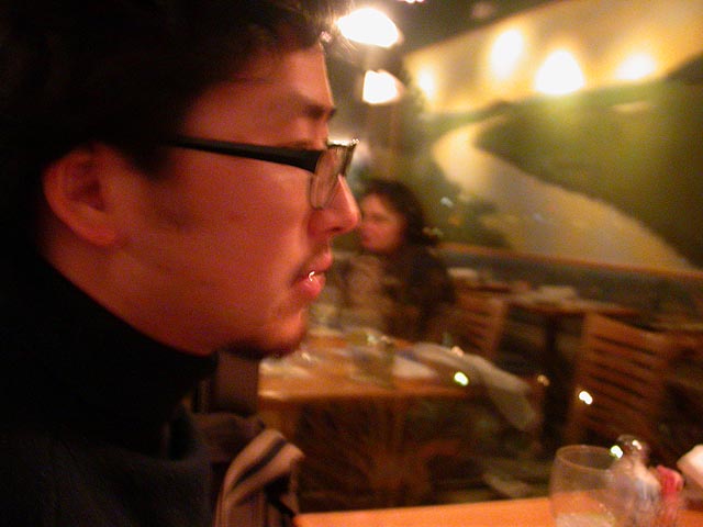 renata and her parents were coming into boston from providence to stay overnight at a hotel so they could get to logan airport bright and early tomorrow morning. i wanted to meet renata once more before she left so i called to see what was up. she told me they'd be coming into boston in the evening and she'd give me a call at that time. at 7:30 she called me saying they were leaving. at 8:30 she called me again to say they were leaving. "where are you guys, like in a restaurant?"