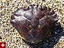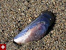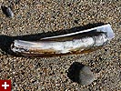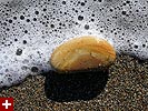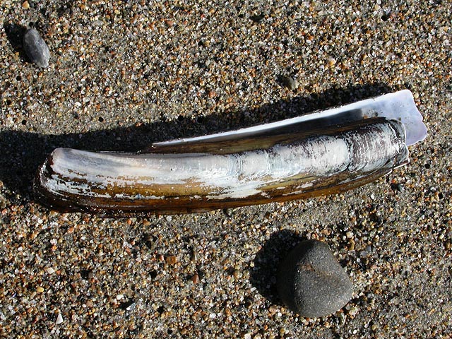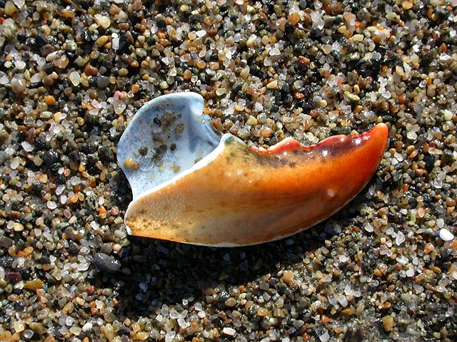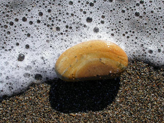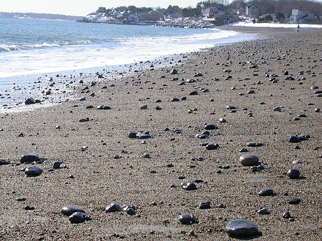 a beach of course sand littered with polished rocks that glittered in the afternoon sun like jewels. there wasn't much to see and the tide seemed to be coming in so the beach was shrinking as we walked.