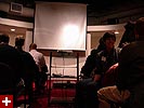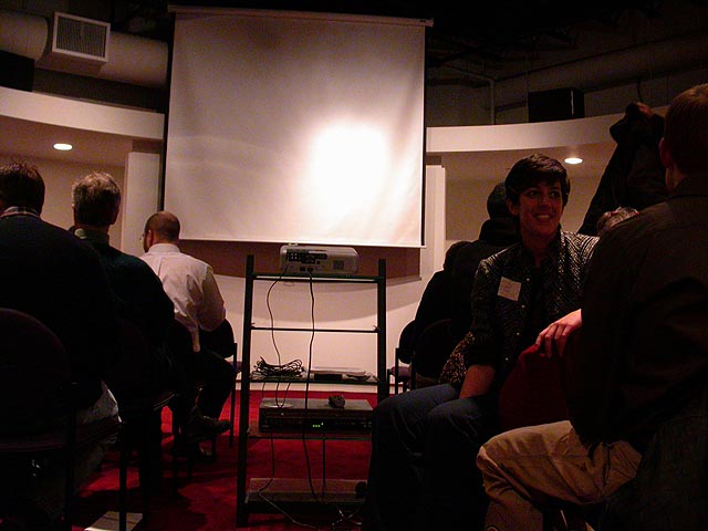 and you could pick up free pens and stickers, along with an assortment of snacks. i grabbed just a drink, didn't feel right pilfering the food table since it seemed reserved for RISD folks. julie and i sat at the far end of the screening room on two folding chairs we carried over. one of the student filmmakers introduced the series and then manned the projector throughout the presentation, switching out the tapes. my favorite short was one shot in this veritae style of college kids goofing off and demonstrating superhuman feats through the creative use of cgi effects. there was another one following the lives of turkish ferryboat sailors crossing the bosporus between istanbul. the last one was the worst one, think napoleon dynamite but without the ironic humor, it was an annoying confusing short that made me want to get a refund on those wasted 20 minutes.