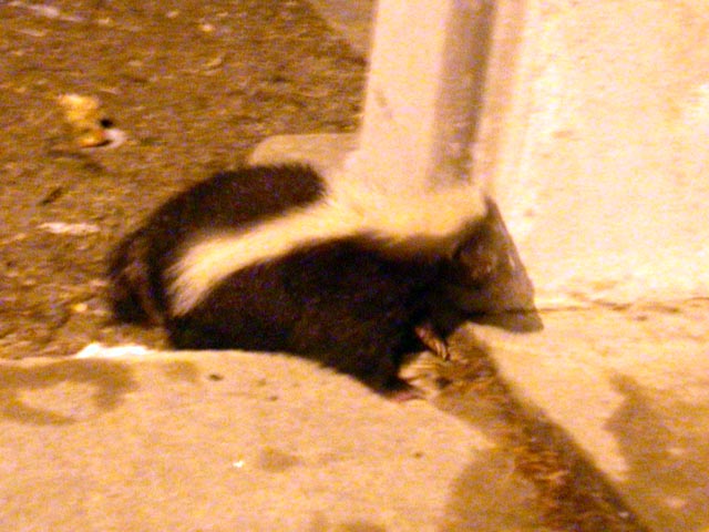 it wasn't in any hurry, made some gestures to run away but came right back when it sensed there wasn't any danger. i took out my camera and snapped a few photos but the skunk wouldn't stop moving. when i followed it across the street, it finally did stop, gave me a warning look, then started moving again. i love skunks. they're cute but nobody messes with them. they're like that short kid you know in middle school who has a black-belt in karate and could easily kick any bully's ass.
