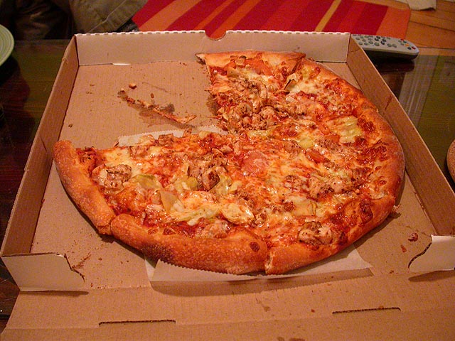 tonight was a special reunion episode, but more like a "let's find a scapegoat and everybody trash her" episode. wendy was the bitch du jour during the first half of the show, but that crown soon belonged to vanessa, who stormed out of the studio at one point. drama! we ordered pizza from topspeed, the godfather (chicken and artichoke), and the guy on the phone didn't give me any shit this time when i asked for the additional tomato sauce julie wanted (most of their gourmet pizzas don't use tomato sauce).