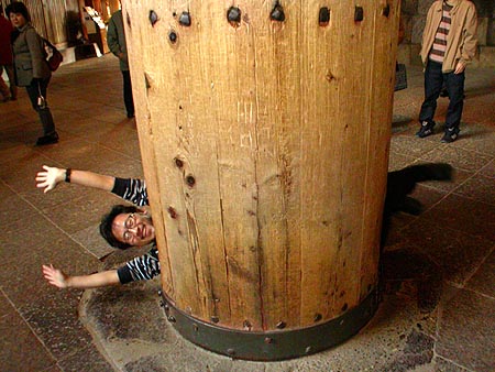at the top of the hill was a colorful shrine. the slight drizzle mixed with the thick smell of incense smoke and seeing the deers made the place have a mystical feel to it. the kofukuji temple was a little bit futher along, next to the five-storied pagoda, the tallest structure in nara according to the woman at the information window back at the station. i saw more deers, and a woman selling special deer biscuits to feed them. i heard shrieking and saw a group of timid japanese women being pursued by a herd of deers, their arms raised in the air as if surrendering, biscuits held high to prevent the deers from snatching them from their hands. i even saw a deer head butt one of the girls when he wasn't getting his way, a possible future highlight for another "when animals attack" special.
