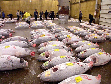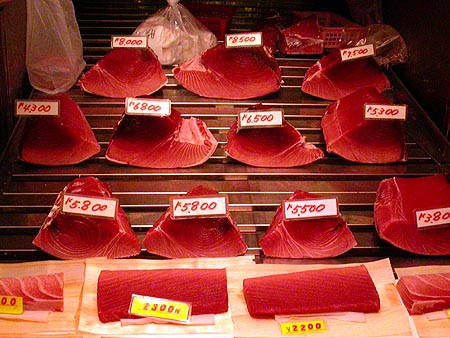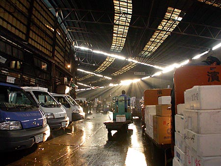 since i've been there before, there was no getting lost this time: take the JR saikyo train (green) from toda to akabane, change to the JR keihin-tohoku train (blue) to akihabara then take the hibiya subway (grey, 160 yen) to tsukiji. once i arrived i made a bee-line to the fish market, walking fast past confused tourists. from a distance i could already see the open doors of the warehouses, the floors lined with frozen tuna that either resemble seal carcasses or torpedo missiles. there was activity everywhere, in one corner somebody might be holding an auction, while elsewhere people might be loading the tuna by dragging them with ice hooks, or inspecting the quality of the fish by examining the cut at the tail and pulling out crumbs of flesh to roll between their fingers. the cool thing about japan is because it's such a camera friendly society, nobody thinks twice when they see someone taking photos. a person holding a camera is just background to them. no matter how busy the action, they seem very accepting of photographers. and perhaps also the fact that tsukiji fish market is a big tourist draw, everyone there have gotten used to tourists taking snapshots. i stood in the middle of the frenzy, seemingly invisible, occasionally moving out of the way of people moving the merchandise around. a foreign girl smiled when she saw me taking photos and started to grab a few snapshots of her own. she had a friend, and when i heard them speak english, i asked where they were from. she's from france, and he's from albany. foreigners never seem to ask me where i'm from because i think they assume i'm japanese, so i usually add my own, "i'm from boston."