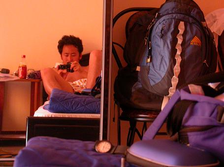 these morning arrivals are a killer. i just spent 12 hours on a really uncomfortable bus with no bathroom, and i'm thrown into a town i've never been before, and it's really early, and for some reason, maybe because we're closer to the equator, it's crazy hot, and my first priority is to find a place to stay, if any hotels are even open. in my pocket was a business card for a cheap guesthouse catering to japanese tourists. i go there and the doors are locked, there's a metal gate, i can't even see inside. so i go to the hotel next door, and they want to charge me US$10 for a dark room without even a balcony. i say no thanks and prepare to search some more, but then across the street my eyes catch an attractive young woman opening up the japanese hotel. i was already sold on tight pants, i was prepared to stay no matter what. turns out the place is cheap, for US$5 i can get a room with a fan, but for US$8 i can get air conditioning and a tv. so i choose the more expensive option because, as you know, i am a high roller! the AC feels great but i soon discover that the tv only gets local, no MTV asia, no sweet kylie minogue videos to chase away those lonely nights. it's still crazy early, and i figure no places are opened yet, so i spent my time doing laundry in the sink and hanging them off of the balcony, i feel so macgyver. oh yeah, i also shower the stink of my body, and this place even has shampoo (i haven't shampooed since hanoi, i've been using just soap, somewhere out there a stylist is crying for me). i leave the hotel at 10AM and go looking for food, coincidentally at a place called