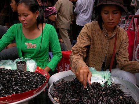 it's my last day in phnom penh, the cambodian capital. of the cities i've visited so far in southeast asian, i like phnom penh the best. not the modern urban sprawl that is saigon, not the old world asia charm of hanoi. phnom penh is somewhere in the middle. you can just as easily find dusty unpaved streets as you can find a supermarket straight out of the most modern city. today was a free day, had nothing planned other than to buy souvenirs and wander around the city. that's another thing, phnom penh is small enough that you could walk it (although the intense afternoon heat might change your mind). i had a nice lunch in a restaurant called the chit chat cafe, where bubble ice tea was prominently advertised. i had the lavender (so good) and the mango (so so), then a bowl of pho that smelled great and looked great but tasted just okay. i'm going back there tonight after i finish writing. i came back to the guesthouse, rested, then hired a motorcycle driver to take me to a few markets, where i got some t-shirts and dvd's ("sin city" for US$2.50). i also dabbled in some more STREET FOOD, this time buying a barbecued spider and a bag of cooked beetles. crunchy, tasty, but i'll stick to potato chips.