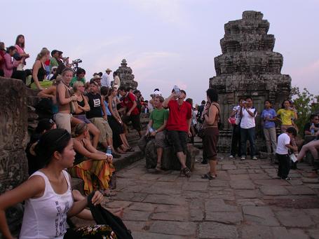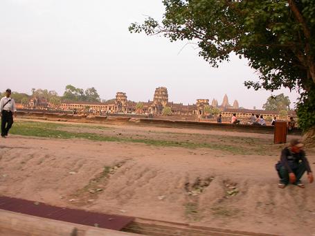at times it seemed like we'd never get here, but we finally made it to siem reap, the town next to the angkor wat temples. the 6:30AM bus didn't leave until 9AM, and half of the seats were reserved for cambodians (funny, i thought it was a tourist bus), and we didn't leave phnom penh until every seat was filled. we'd periodically stop to let people (cambodians) off, until suddenly we came to a dusty outpost where a mob of moto drivers were almost rocking the bus, trying to pick up fares to take to one of the neighboring guesthouses. i already had a guy waiting for me (sunday guest house made arrangements with green guest house, their sister hotel in siem reap), who was holding a placard with my name on it, "MR.TONY." i got to the guest house, booked a room for US$10/night. since it was still early (afternoon), there was enough time for a driver to take me down and see a temple on my first day here in siem reap. after paying for a weekly pass at the checkpoint (US$60, including my photo), we drove by angkor wat. in the golden glow of the setting sun, it looked like a postcard. that wasn't where i was going to though: i went to nearby phnom bakheng instead, to see the sunset over the temples. apparently so did every single other tourist in town, and the hill was mobbed with people. any romantic notion of me slashing through the jungle exploring khmer temples were quickly dashed. i came back to the hotel, showered, then hid in my room watching tv with the AC on, until i got hungry enough to go outside and find food and do some internet stuff. unfortunately i left my USB cable back at the hotel, so i can't upload any photos tonight.