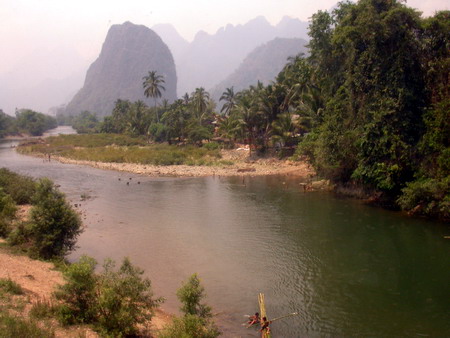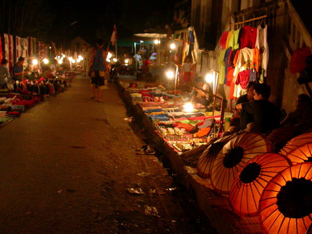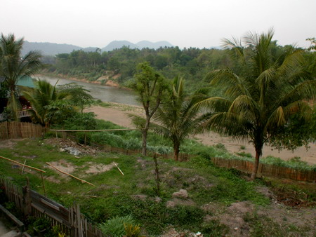 arriving in luang prabang, i was so disoriented, i just got on the first tuk tuk that i saw with a foreign person on it. the guy was a priest, and i basically followed him to where he was going, a stretch of dirt road with a few guesthouses. from the outside they all looked sort of lacking, so i just picked the one i thought would have the best chance of having a TV in the room. outside, a large group of japanese travelers were eating bananas, and they were quick to great me. "nihonjin janai," i told him, but they didn't believe me. i got a great room, big, clean, seemingly-mosquito-proof, sunny, wooden floors, no AC but a big fan, but no TV, although there is an awesome balcony overlooking palm trees and a river, like a crazy tropical bungalow all for US$8. i took the room, but after seeing where it was on the map, it's kind of far from the center of town, about a 15 minute walk uphill. i'm going to look to change my guesthouse but if i can't find anything better i'll stay. so after a hot shower i headed into town, where my first impression of luang prabang is that it's a lot like hoi an, all sleepy and quiet and hot and foreigners walking the streets.