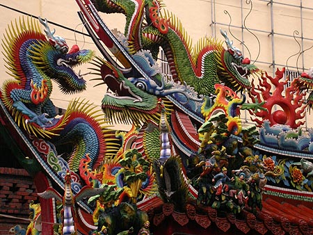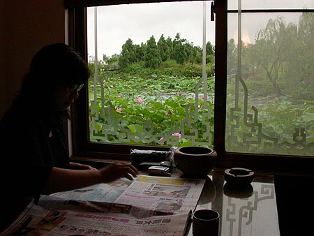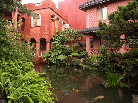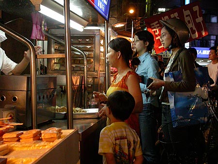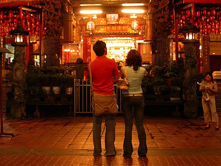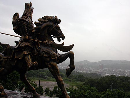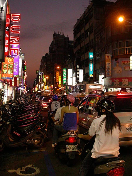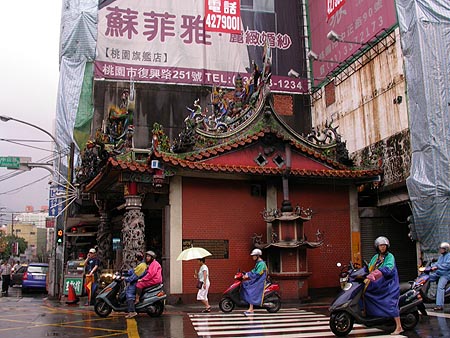 this morning i visited my grandfather for the last time (in taoyuan, about an hour away) then liou-ayi drove me around in the rain visiting tiger head mountain (a sign read in chinese, "beware of poisonous snakes," which only made me want to stay even longer) and some chinese temples before treating me to lunch in a fancy restaurant situated in an amazing classical chinese garden. she dropped me off in downtown taoyuan where i roamed around a bit before catching a bus back to taipei. unfortunately i rode the wrong bus, because it took a long time to get back to the city, but we did pass many glass-walled betel nut booths, housing scantily-clad betel nut girls busy serving customers driving by in their cars/trucks (no photos, don't ask).