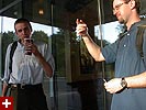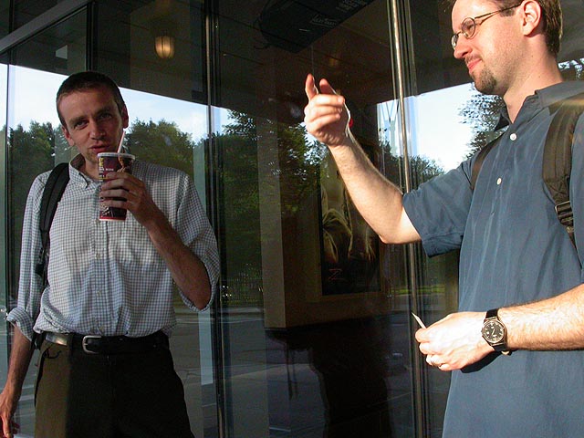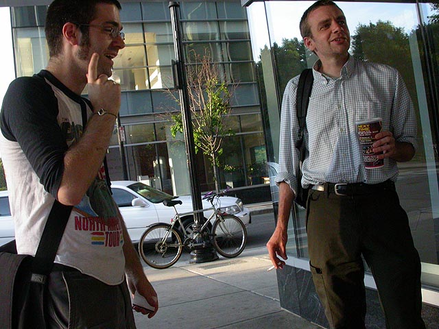 another hot day, i had the air conditioner on as soon i was up. i had a few little errands i had to do around the house, like pay my bills. rummaging through my bag i was horrified to discover the glass screen of my gps was cracked. poor gps, survived southeast asia, but gets damaged back at home. it still works fine though, despite the damage. i'll need that gps, for when i go naturing. after a lunch of korean ramen, i went out for a run. 88 degrees, i ran through sprinklers and put my head underneath the drinking fountain to cool off. coming back, i ran into joel, cruising down mass ave in his jeep. i also bumped into my neighbor jeff, who told me he discovered my weblog after doing a search for "apple tree." besides bruce, none of my neighbors know about my web presence. and usually during conversations with new people, i almost never bring it up. the reason is simple: if they don't know about the site, then i can talk about them all i want. but if i know they're reading it, then there's some amount of self-censorship.