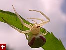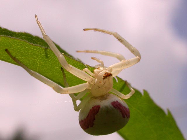 there was a large parking lot, empty except for a USPS van (mailman on a lunch break). there was a large open space with some nondescript wild flowers, a white goldenrod spider conspicuously out in the open, trying to snare a meal.