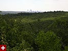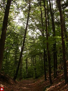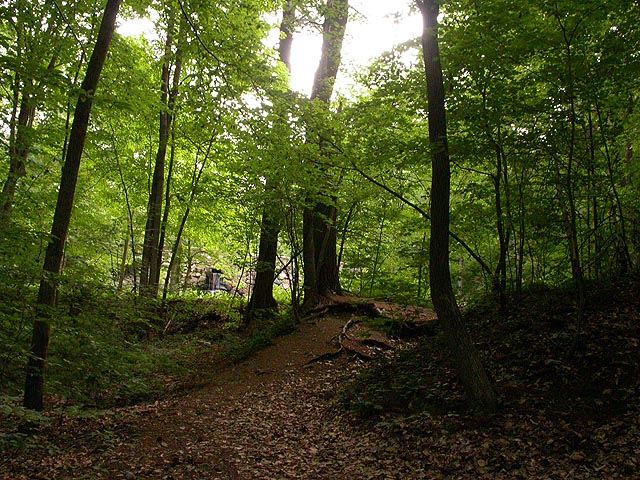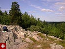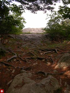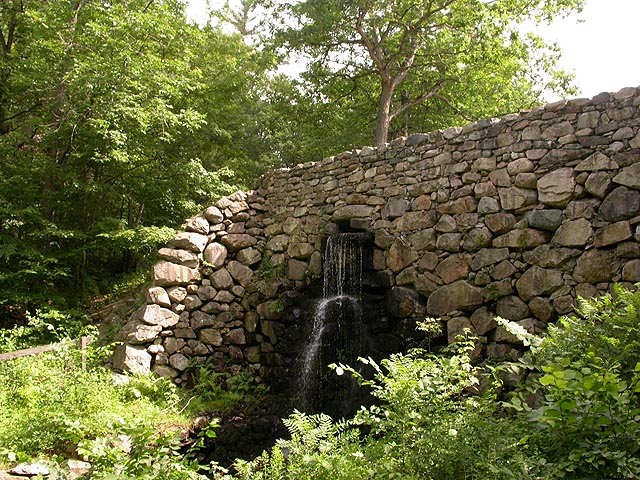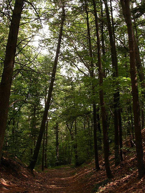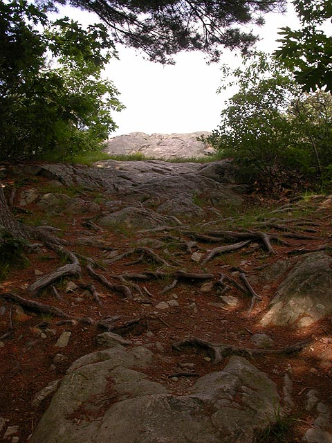 the nearly 600 acres of noanet woodlands is situated in dover. i don't think i've ever been to the town of dover before, but from my childhood interest in the strange and mysterious, i know it to be the home of the dover demon. that didn't stop me from getting on my motorcycle and riding down there for a bit of naturing. i wasn't alone: occasionally i'd meet other people hiking, mountain biking, or walking their dogs. the marked trails were very wide, with many smaller unmarked trails branching off into the woods. i didn't have a trail map other than the abbreviated hand-drawn one in my "nature walks in eastern massachusetts" book, and a digital photo of the map inside the bulletin board back at the entrance. i essentially followed the route suggested by the author, walking to the old mill site with its small waterfall and holding ponds, then to noanet peak, a rocky summit with a view of the surrounding green ocean of forest and the boston skyline off in the far distance. a beautiful day, i was the only person up there, and i lounged on the rocks for a little bit, enjoying the sun and the tranquility, before walking back to the parking lot. the recommended walk is 3.5 miles, but it took me nearly 4 hours to complete the loop.