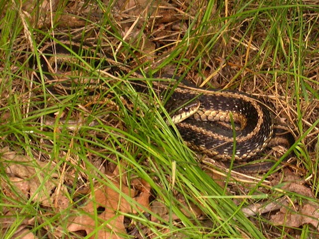 i finally found some snakes, which thrilled me and repulsed me at the same time. i'm not afraid of little snakes anymore, although their slithering action still seems kind of creepy. here at noanet woodlands i saw the big snakes, the kind that freezes me in my tracks. while standing on a rock wall by the waterfall taking photos of whitetail dragonflies, i heard something drop down below. without even thinking, i guessed it might've been a snake, and when i looked over the edge, sure enough, a large garter snake could be seen in the grass. i walked across the rocks but i must've made too much noise because the snake suddenly slithered away in less than second. from where i stood i looked across to the other end of the wall, and was horrified to see another snake, larger than the first, coiled in a circle. i slowly walked over along the top of the wall, looking down at a mature water snake. i was worried that i'd fall off the wall, because not only would i land in a snake pit, but it was also covered with poison ivy. later, when i walked down to the stream, i saw a small (diameter of a pencil) water snake slither off of the path when it felt the vibration of my footsteps, and a 4th snake running away as well (i didn't get a good look at it, it was black though). there were some kids playing by the mill, and i thought about telling them about the water snake, but after seeing them splashing rocks into the holding ponds, i figured it might not be a good idea.