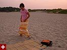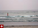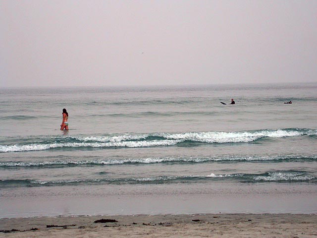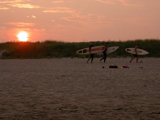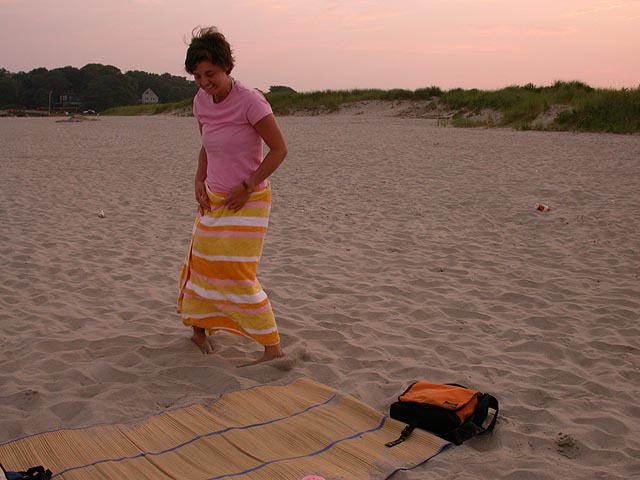 we didn't go to the beach right away though; first julie had to get some ice cream. i had a small maple walnut in a sugarcone myself, but it was a messy affair and i ended up with ice cream all over my goatee ("saving it for later"). after 5pm the beach parking lot is free; we were there at 7pm (the lot closes at 8:30). as soon as we found a spot to park our bags, i was walking slowly towards the water. the waves crashed onto the sandy beach, the atlantic ocean as freezing as always. in just a few seconds i was already cold and wanted nothing more than to warm up again. the weather looked like it'd rain when we drove up there, but soon we saw the sun peeking through the clouds. the beach was surprisingly crowded even though it was late, many people there escaping the heat like us. surfers rode the small waves near the rocky coastline, unleashed dogs splashed in the water, and children ran around with boogie boards. julie listened to the red sox game on her radio while i waited for green-head flies to bite me so i could take a photo for the sake of science.