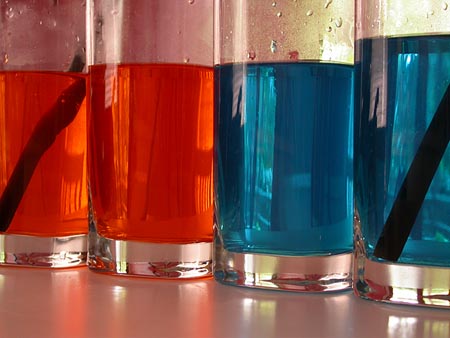 i woke up this morning anticipating a call from a client which never happened. when i realized i wasn't going to norwood, i started planning out the rest of my day accordingly. i invited julie to come over tonight to watch the baseball game, but didn't know what i'd be making for dinner. after looking through past issues of food magazine, i decided to go with some instant rice and sichuan style salmon steaks. while rummaging through the kitchen cabinets i came across some jello mix i'd purchased a while ago. i decided to make fancy jello, alternating bands of orange and blue. i poured the mixtures into glasses and let them solidify in the fridge (the instruction calls for at least 4 hours).