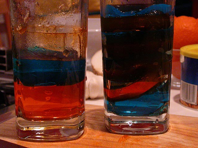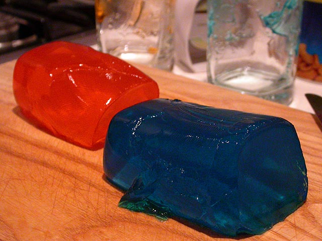 but putting the pieces back into the glass with alternating layers resulted in an ugly disaster. kristine suggested forming the layers naturally, through a series of pour and refreeze of alternating colors (she did this as a kid, it's tedious, but it seems like a sound idea).