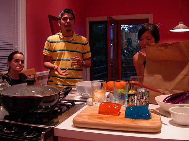 the last time kristine, james, and i met was about a week before i left for southeast asia back in february. most of the friends i have nowadays are mostly former coworkers. usually it's but tonight was a rare occasion with just folks from squid country safari. james and jaime arrived first, traveling via MBTA, bringing with them some pad thai. kristine came shortly afterwards bringing with her some green tea ice cream, and said she would've been here earlier if she didn't get sidetracked in the porter square area. i gave them a quick tour of the place (none of them had ever been to my house before), then we chatted in the living room, enjoying the air conditioning. screen house people,