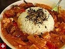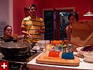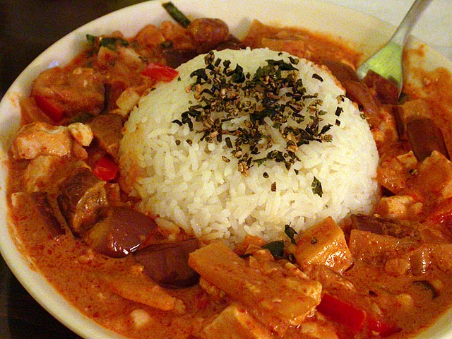 i started cooking around 7pm, everyone following me into the kitchen to watch the show. it's been a while since i had thai red curry, so i was a bit rusty and had to look at the recipe taped to the fridge. the only change came from the fact that kristine's vegetarian,