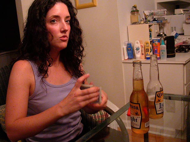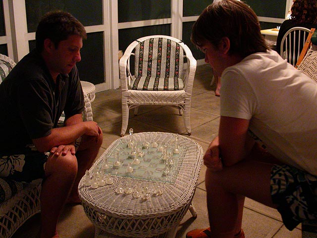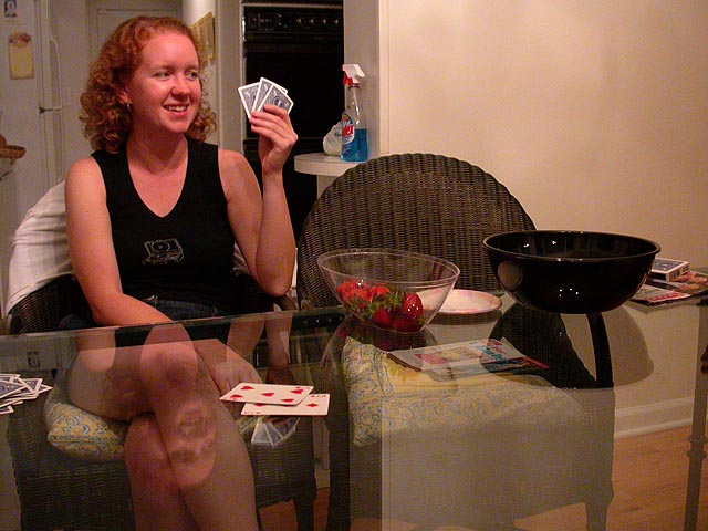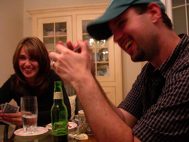 mariane, may, and andie started a game of scrabbles, dan was absorbed by an abbreviated solitaire version of chinese checkers, and mark and brendan were engaged in a serious chess match. later, those of us who were still awake (mark and brendan went out clubbing) played a rousing game of non-drinking asshole. megan, who promised herself she wouldn't drink this whole weekend, was fighting temptation all night long, a few times suggesting we'd raid the liquor cabinet and do shots. finally by midnight she broke down and went to the garage and came back with a double serving of corona (i think she ended up going 6 bottles, party girl!). michelle was the big winner, staying president for most of the rounds, while i was the big loser for most of the game. at one point dan and i became president and vice president (boys rule!) but that only lasted one round.
